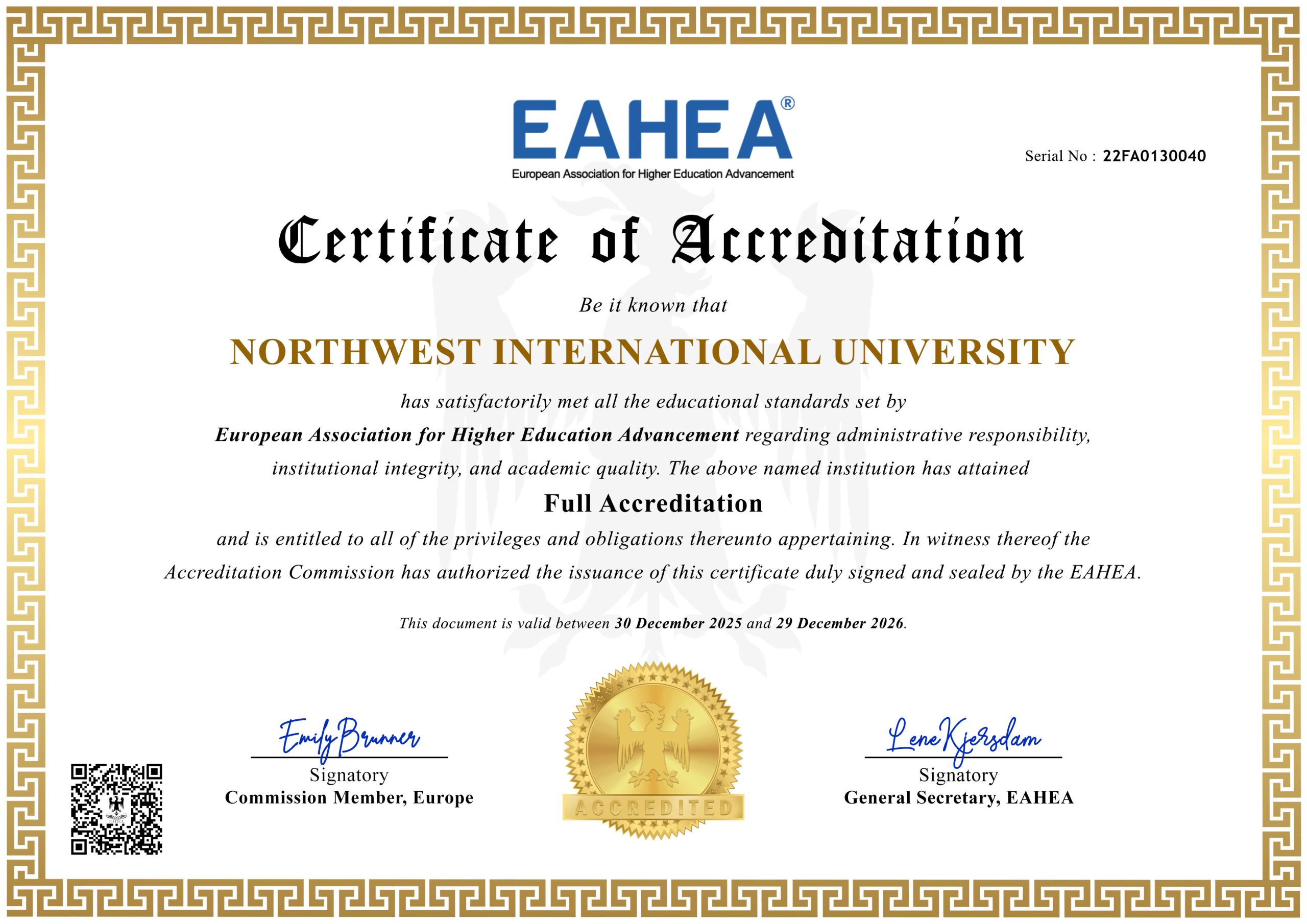 Northwest International University has been granted Full Accreditation by the European Association for Higher Education Advancement (EAHEA), an independent international body committed to advancing quality standards in Europe and internationally. EAHEA is an active member of several global networks and collaborates with leading organizations such as BQS, QAHE, and INQAAHE. This accreditation affirms that Northwest International University has fully met all standards in academic quality, institutional integrity, and administrative responsibility, highlighting the university’s commitment to global excellence and best practices.